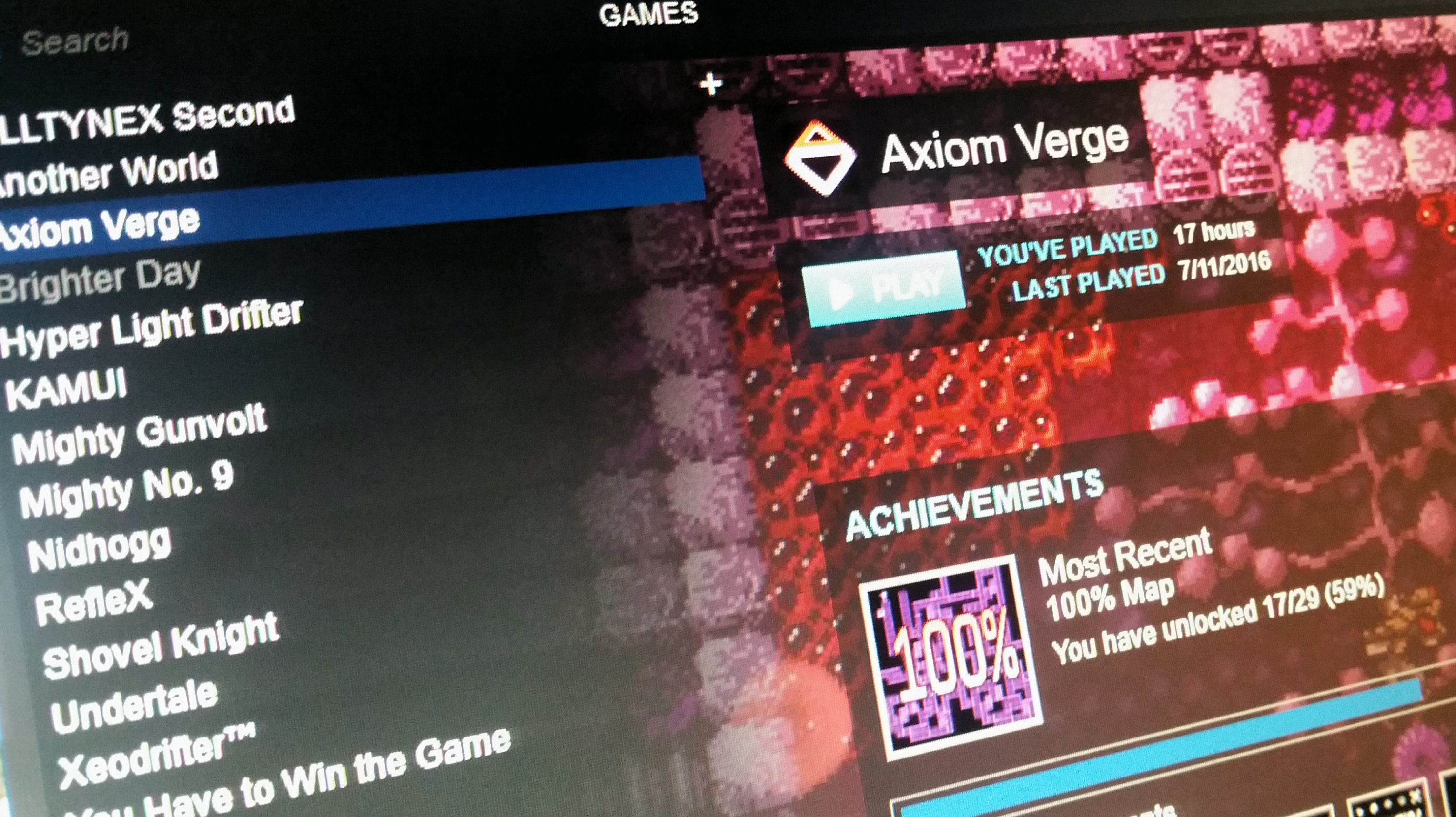 And that’s it. That’s all I have for the PC. There have been a few games I’ve been sort of interested in over the years, but not enough to beef up my PC to gaming level (I usually just need enough power to run Photoshop). I do play emulators and a few Steam games – mostly retro-themed stuff like Shovel Knight and Axiom Verge, which have actually made me a bit more enthusiastic about the PC as a gaming platform.