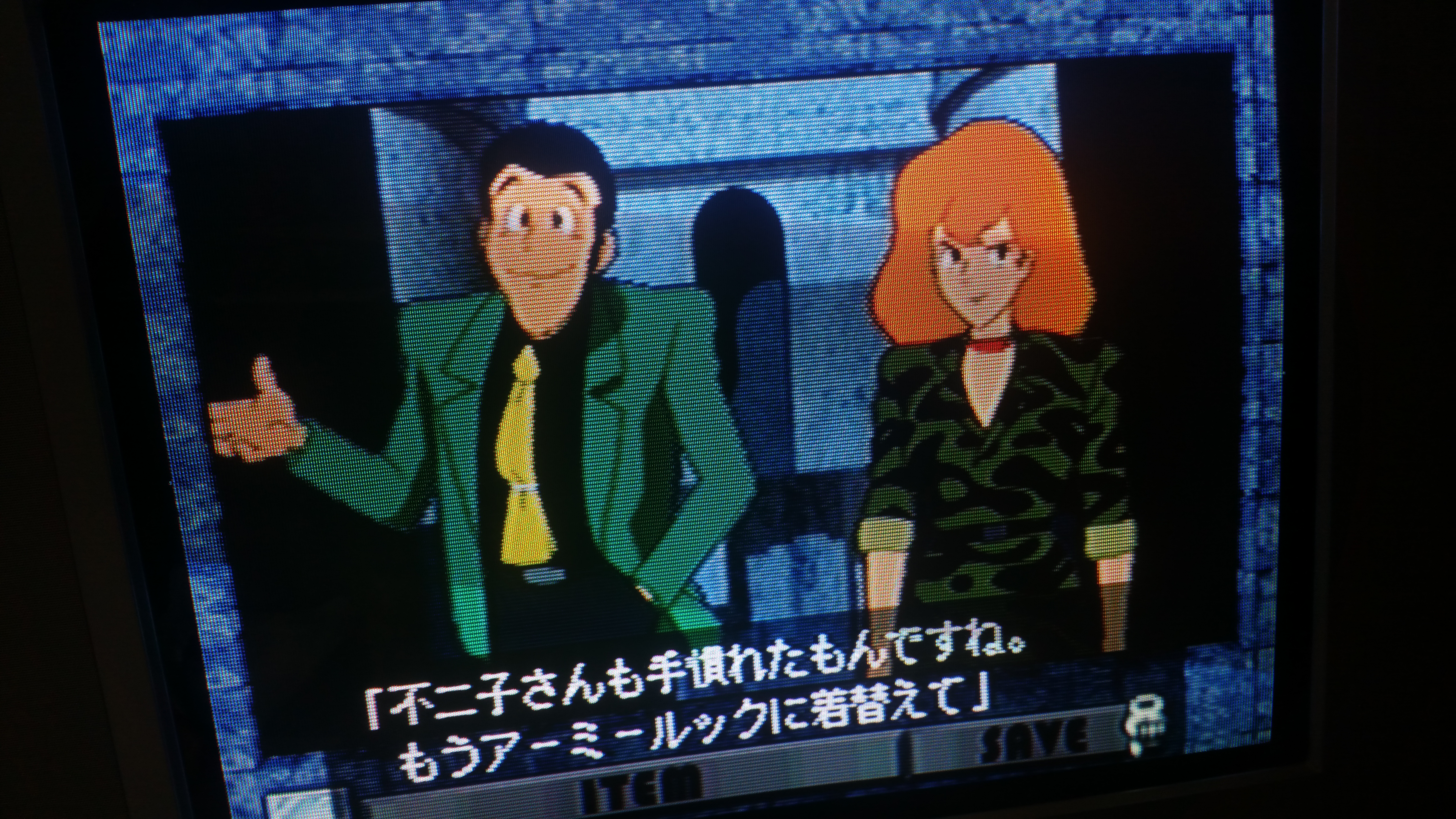 Asmik’s 1997 PlayStation release, Lupin the 3rd: Castle of Cagliostro Reunion, is actually my favorite Cagliostro game. It’s a first-person, point-and-click adventure where you play a visitor to the the country of Cagliostro. You poke around the town until you find a man with a “virtual machine,” which you agree to enter (for fun, or for science, or whatever, I’m not fluent enough in Japanese to have gotten that part). Once inside, you actually meet Lupin himself, and go on an adventure that basically retraces many of the steps of the movie’s characters (all of whom you meet), with a new mystery to solve.