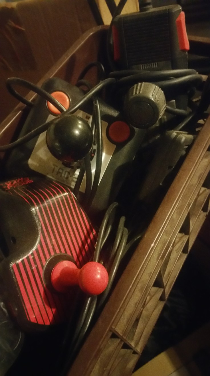 The small box is some arcade sticks and buttons from a project I never finished. Looks like an old Blip and a Tomytronic 3D (the racing one), and up front is a load of 2600 controllers.
