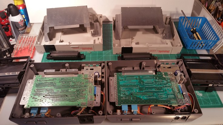 I tested four NES consoles that I dug out of storage. One, to my shock and surprise, actually worked pretty well, so I marked that one “NOT BAD” and set it aside. Another unit ran a game and sounded fine, but had a serious video-out problem, so that one’s a whole different issue. The remaining two exhibited the classic blinky-blinky problem, so there were my two prime candidates for this experiment.