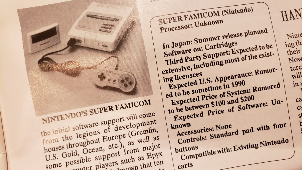 The first time I ever even heard of the Super Famicom was in the first issue of Electronic Gaming Monthly, which I bought, and still own. It showed a small, blurry, black-and-white photo of the prototype hardware, considerably different from the final model, and listed some now-interesting inaccuracies, such as a “four button” pad (not realizing there were shoulder buttons, which was a whole new concept at the time) and backward compatibility with existing Famicom cartridges (which we all wished for, but did not come to pass).