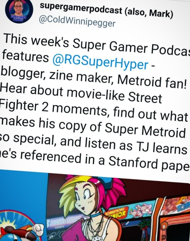 Mark from Super Gamer Podcast interviewed me for episode 63 of his show! We talked about the blog, the zine, Nintendo merch, SF2, Pitfall, buying games, Metroid, gaming goals, and a bunch of other stuff too. Listen here!