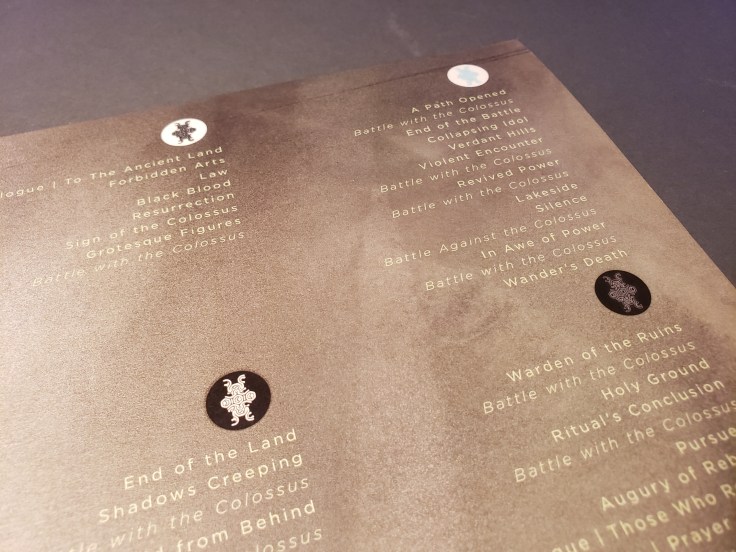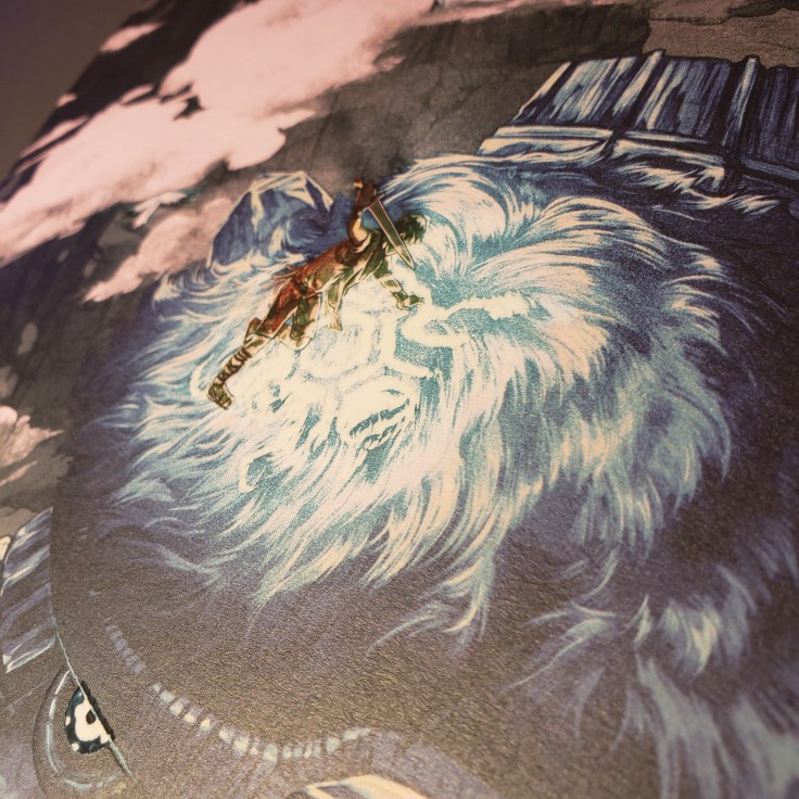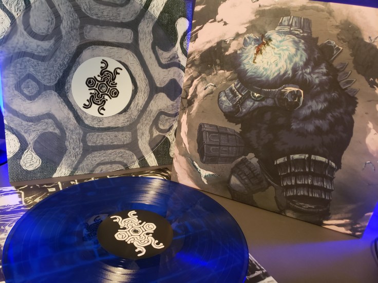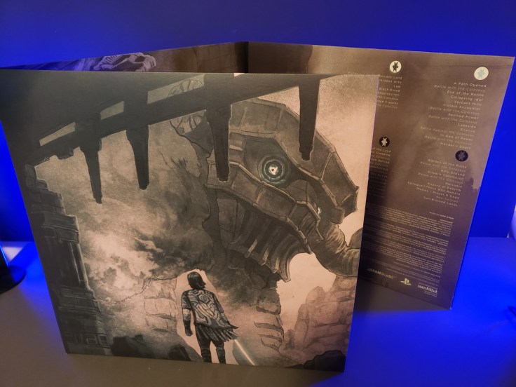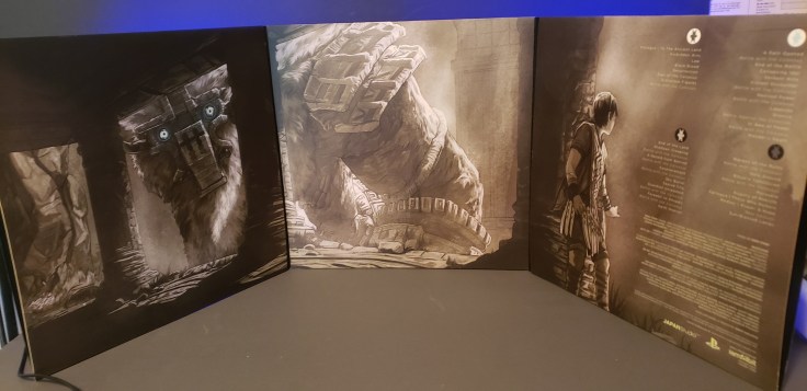 So, let’s start with the Shadow of the Colossus soundtrack, since it technically came out first. iam8bit has pressed the game’s epic score by Kow Otani onto a double-LP set on colored vinyl (one clear, one blue) in a triple-gatefold jacket. I will let the photos do the talking regarding the quality of the artwork and packaging.