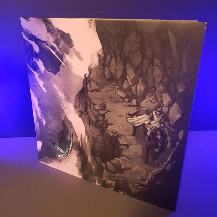 The jacket is a matte finish, with light embossing and hits of gloss print. The front cover shows Wander about to take his first stab at the sigil in Valus’ forehead; on the back, Wander cautiously navigates Argo through a treacherous mountain pass.