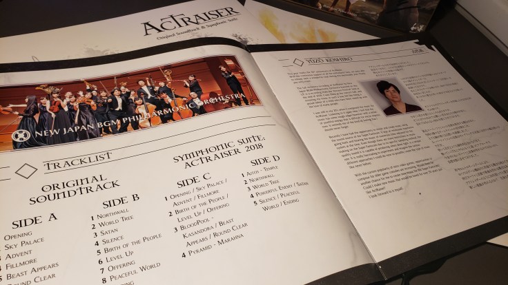At first, I was a little confused as to why the packaging didn’t feature the original Super Famicom box art or the original Actraiser logo. I then realized that this release is licensed by Ancient (Koshiro’s company), who must retain the rights to the music, but the artwork is probably owned by Enix (or Square Enix now) — or possibly is not owned by anybody and is lost to the sands of time. At any rate, it doesn’t matter — the brand new artwork was done by Yuzo’s sister, Ayano Koshiro, who was a graphic designer and artist for Actraiser and many other classic titles like Streets of Rage, Sonic the Hedgehog, and Ys.
