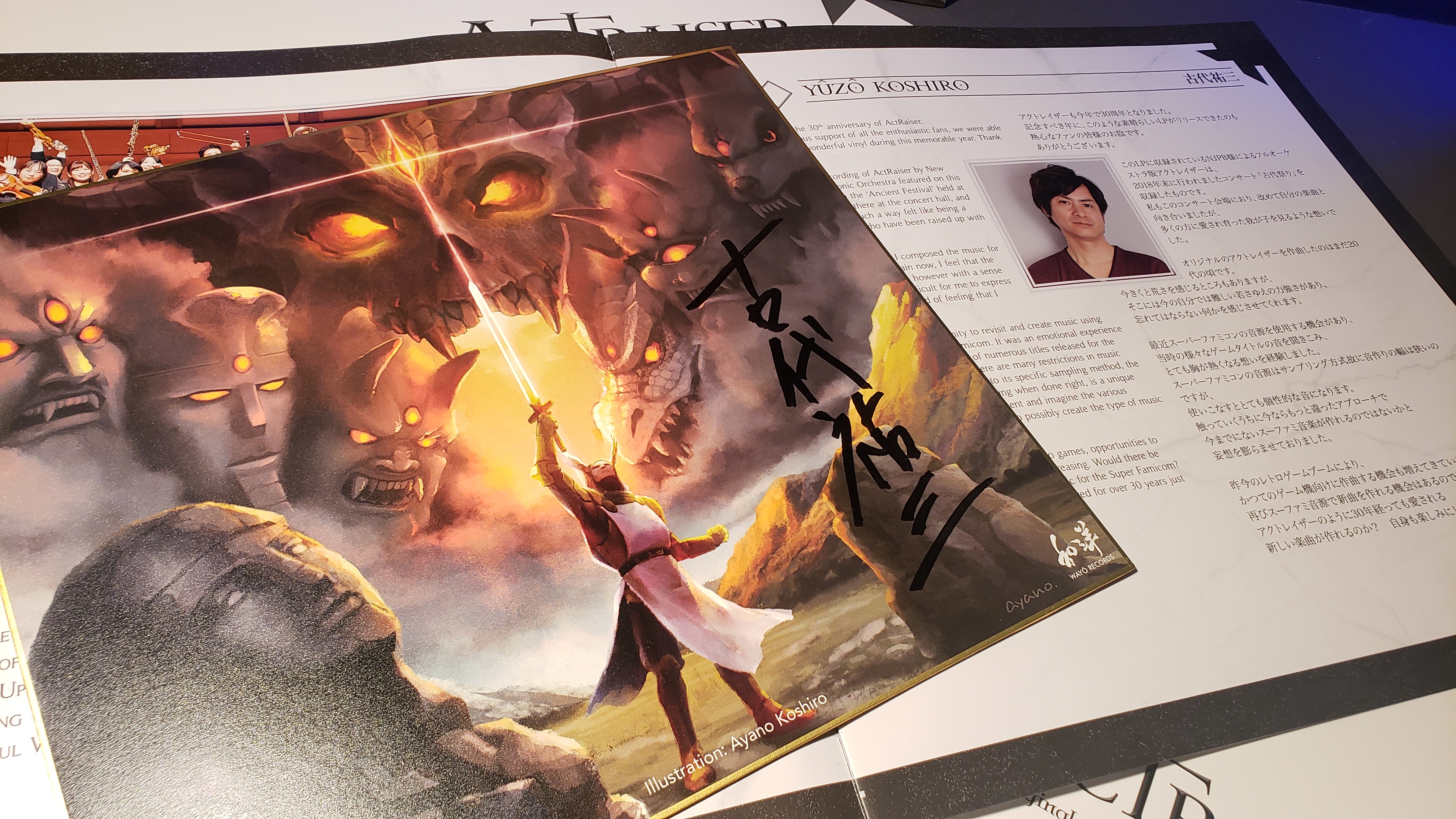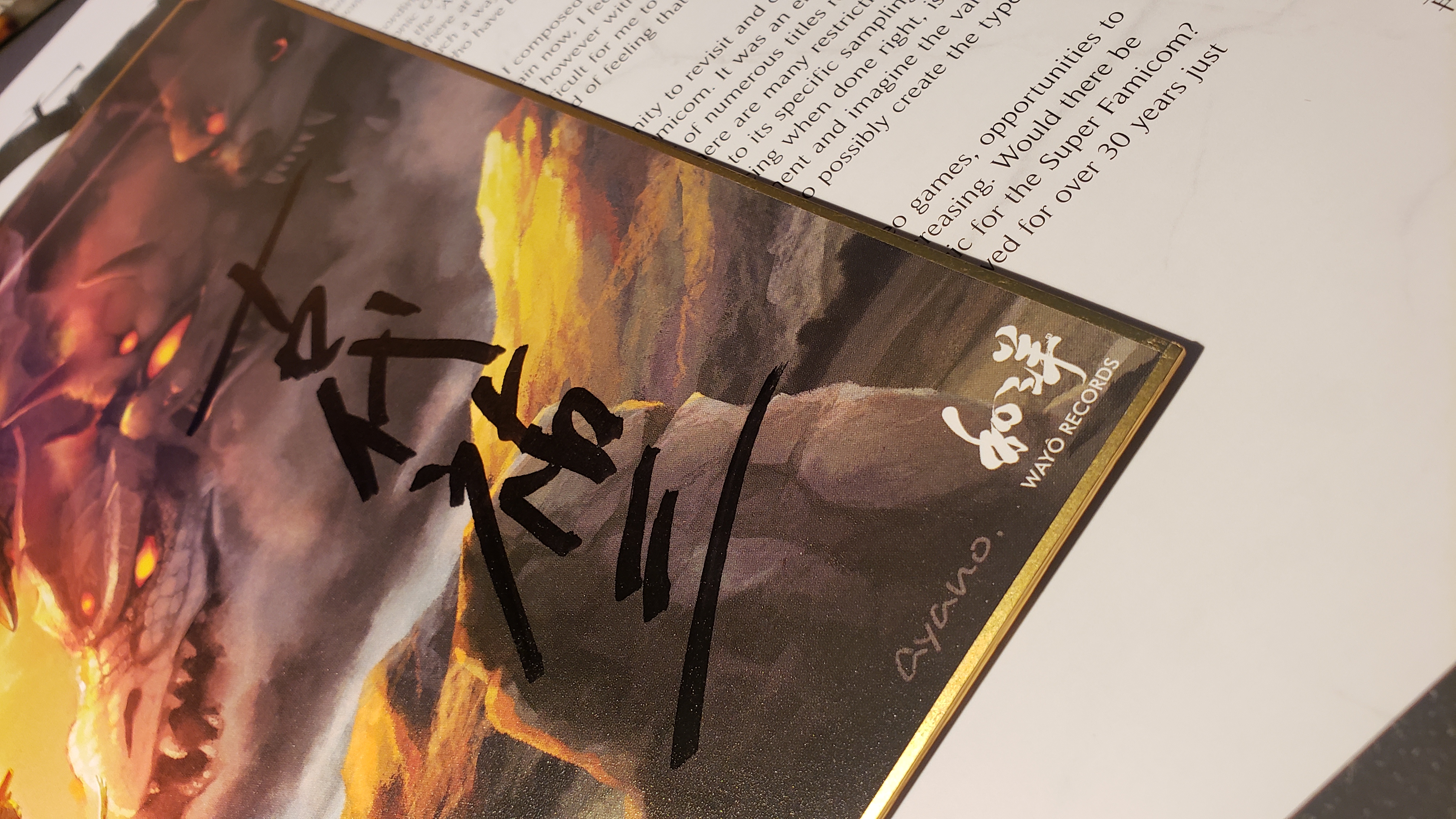 But possibly the most delicous carrot that Wayo Records dangled in front of enthused pre-orderers of this release — not that I needed any other motivation to immediately hurl my money at them for this — was the offer of a shitajiki (a board commonly used for autographs or doodles by celebrities for souvenirs), printed with this exclusive new artwork, and hand-signed by Yuzo Koshiro himself. Limited to the first 250 vinyl orders, I believe I heard they were gone within the first day that pre-orders went live. Fortunately, I was among those initial 250, and I now have Yuzo Koshiro’s autograph, and I’m still super frickin’ excited about that.