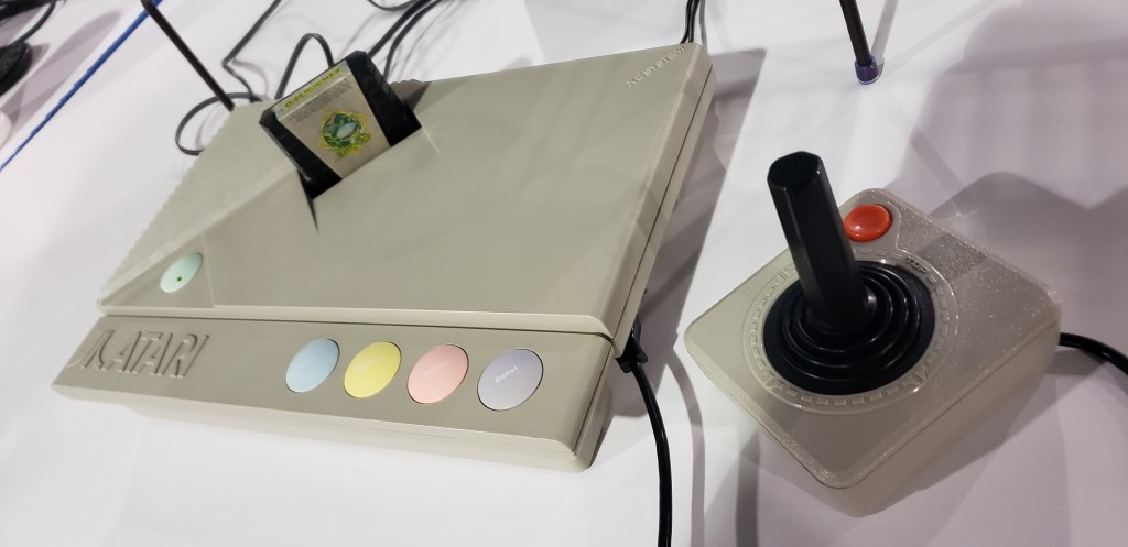 First was the aforementioned Atari XEGS. This console plays all Atari computer cartridges, from the Atari 400 and 800 to, of course, the Atari XE. Its unusual grey-and-pastel color scheme and funky angled cartridge slot make it one of the most unique-looking game consoles ever.