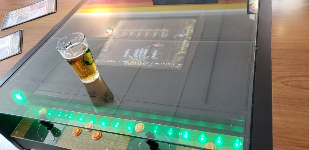 Should you decide to belly up to the bar for a drink and a snack, however, the gaming doesn’t have to stop. There are two monitors built directly into the bar with control panels beneath them, which run JAMMA games that can be regularly swapped out. When I was there, it was In The Hunt and Final Fight ready for action.