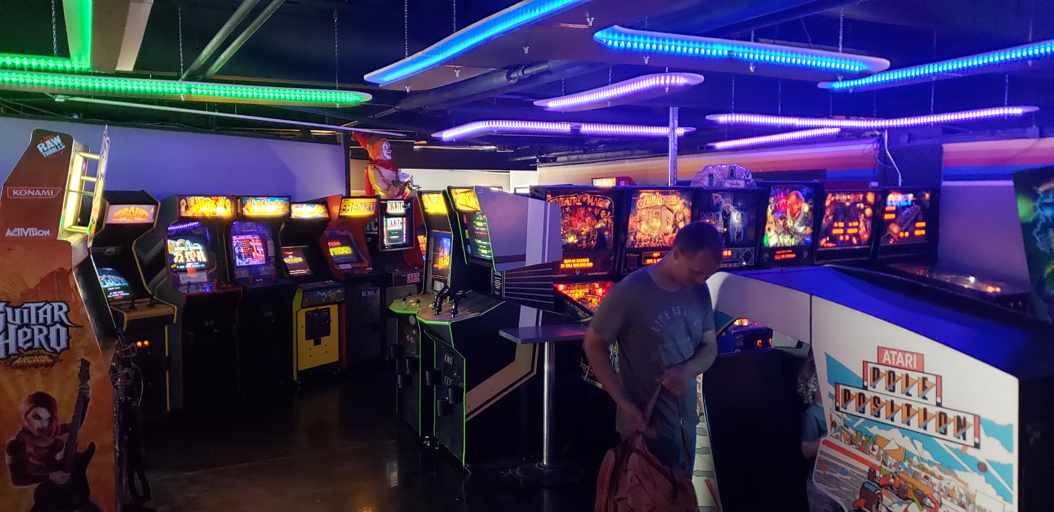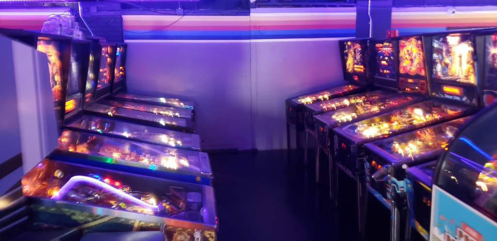 About a dozen pinball machines anchor the center back part of the arcade (in addition to a few in the bar), a choice selection including Twilight Zone, Black Knight 2000, and Monster Bash.