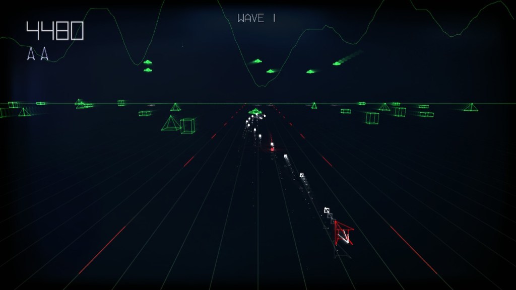 Finally, we have VKTR-SKTR, which is an homage to all the amazing vector-monitor arcade games in Atari’s history. With a variety format similar to something like Tron or Gorf, each level is a take on a classic Atari vector game. You start by choosing to pilot either a single Asteroids ship, or an Asteroids ship and an Asteroids Deluxe ship that are linked Space Duel-style. The first part has you blasting asteroids, followed by landing your ship ala Lunar Lander. From there you race along a highway in 3D and blast Battlezone enemies, after which your ship blasts off into a Tempest level. Completing all four sections is one wave, and of course, each wave gets progressively harder. I must admit, I think VKTR-SKTR might be my favorite game out of the entire collection.
