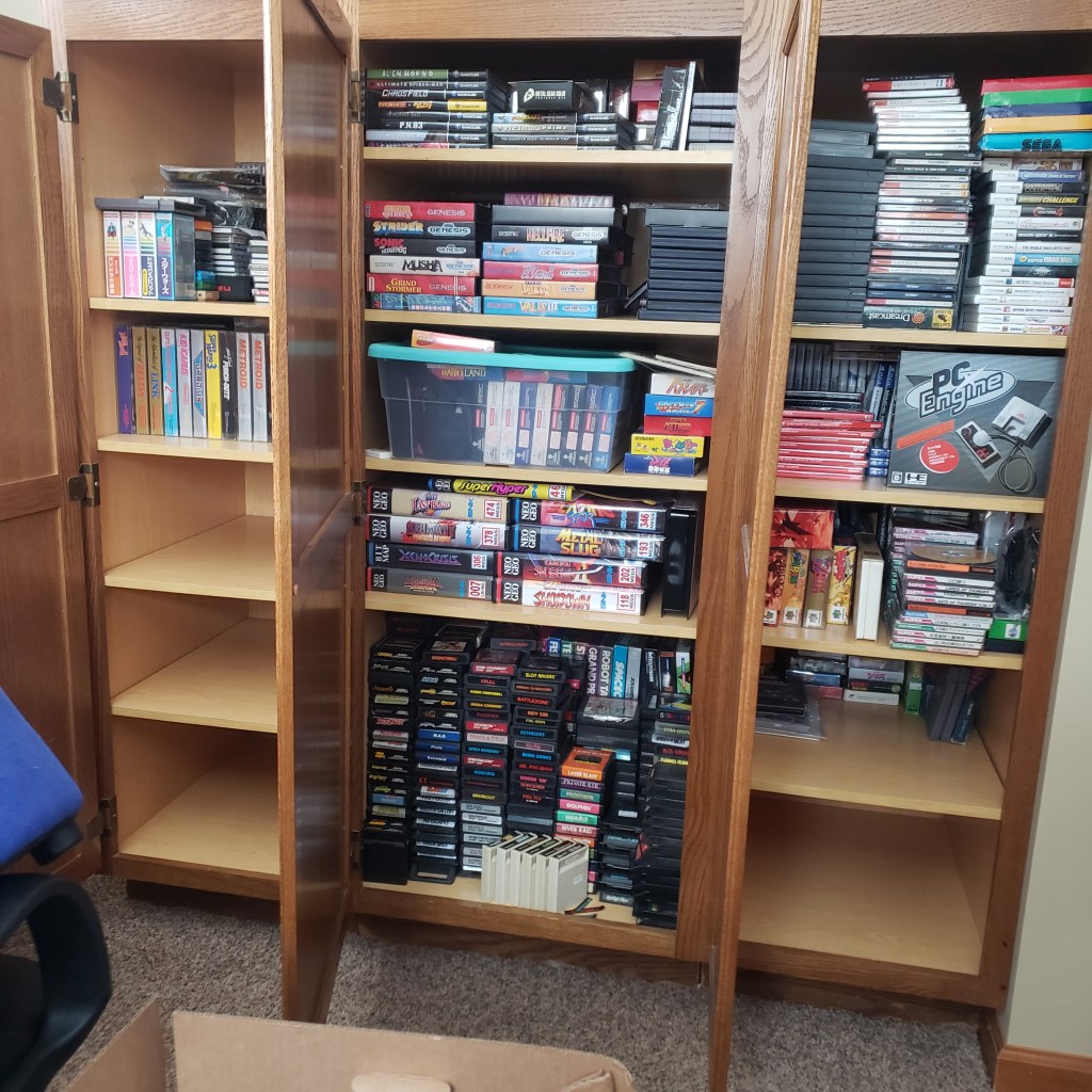 Here is my first dilemma: I have these awesome, spacious, built-in shelves, which as you can see are more than enough to hold all of my games with room to spare. However, they’re very deep; what you see here are up to three layers deep of stacks of carts and discs. I don’t feel the need to display my games — I’m fine with them being hidden from view in these cabinets — but I also don’t want to have to dig through three layers to retrieve a game in the back. So I need to come up with a solution for accessibility, while also utilizing the space I have to the fullest. Perhaps some low-profile plastic bins, that I can pull out?