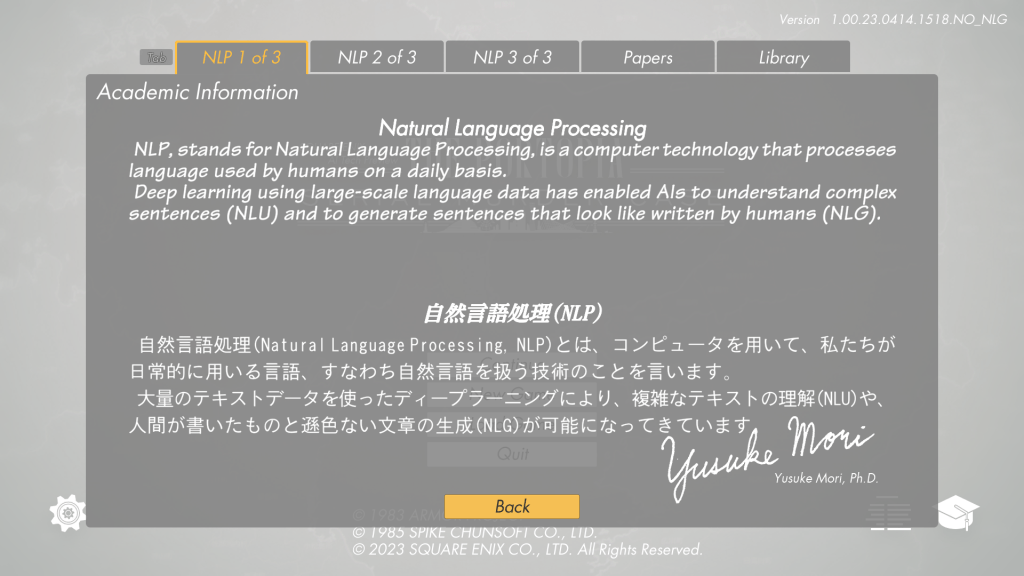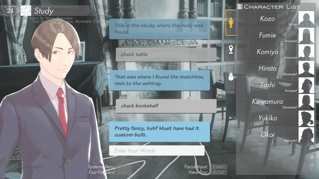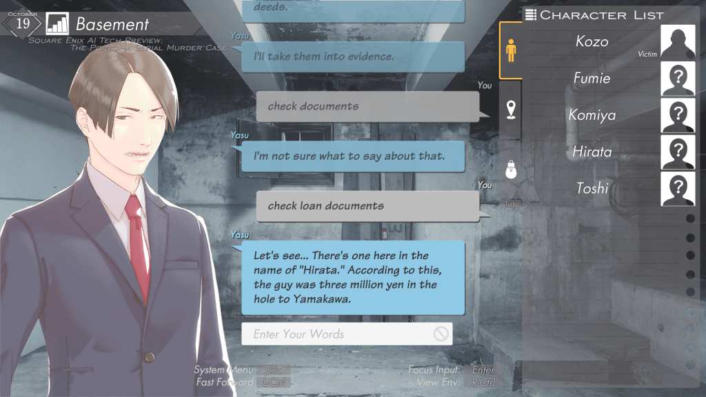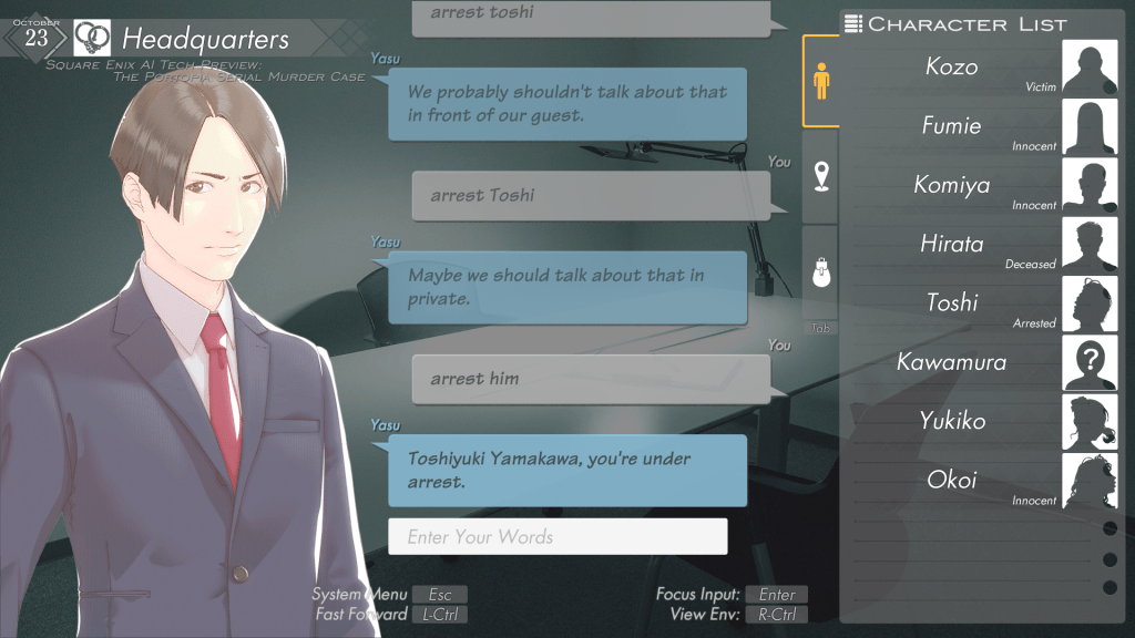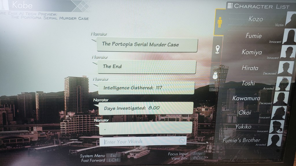 Anyway, I’m very happy that Portopia finally got an official English-language release, but I’m hoping that this NLP tech will improve now that the game is out in the wild. If they can do so, then AI language processing really could change the adventure game genre into a much more dynamic and free-form style. Although PSMC23 appears to be a misstep right out of the gate, the potential for it to be a significant milestone in gaming history is there. I look forward to Square Enix updating it and making it much more intelligent and accommodating (and for all i know, by the time you read this, perhaps they have) and hopefully they will realize the vision that I think they had for it.
