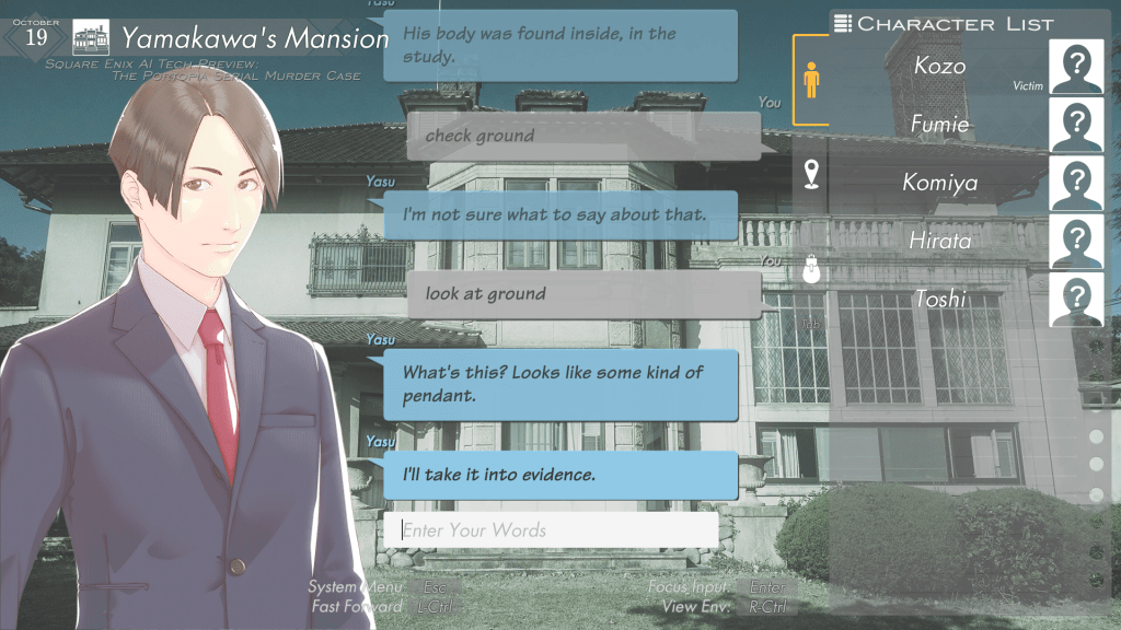 …Unfortunately, the system doesn’t quite work as advertised. I didn’t even know SE was releasing a new version of Portopia until I read an article about how bad it was. But it’s a free download on Steam, and I love Portopia, so of course I had to investigate it for myself.
