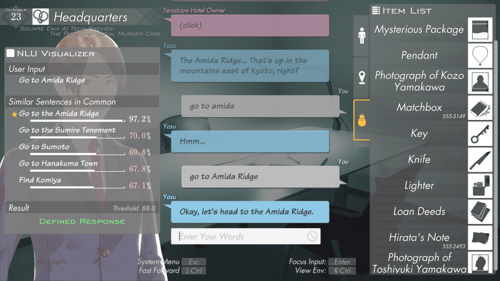 Since neither the game nor its online menu give you any such specific instructions as to proper verbiage to use — other than to keep in mind that you are always speaking to Yasu, your assistant, and not directly to the other characters — it gets frustrating pretty quickly, especially since this is being advertised as an AI language recognition “preview.” (If this is a preview, I’m not sure what their future plans for it are.) “Natural Language Processing” certainly implies that the game should be able to recognize a multitude of ways to say the same thing, but that is clearly not the case. As it is, it just feels like an over-complicated text parser.