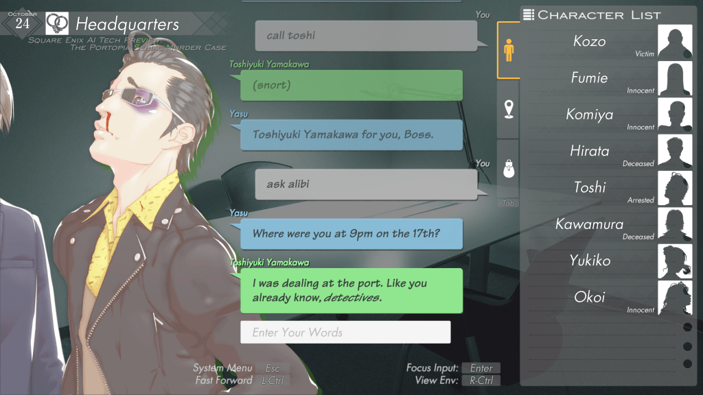 For example, if the player is questioning a suspect, one would think asking for their alibi would be as simple as typing in “what’s your alibi,” or even simplifying it down to the most likely effective verbs and nouns, like “ask alibi.” But instead of picking up on those essential keywords, the correct way to ask is, “ask for his/her alibi” or “what is his/her alibi,” with pronouns and everything…